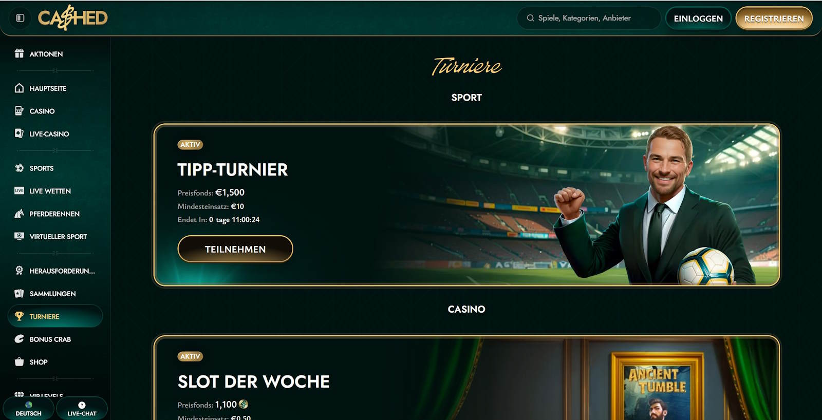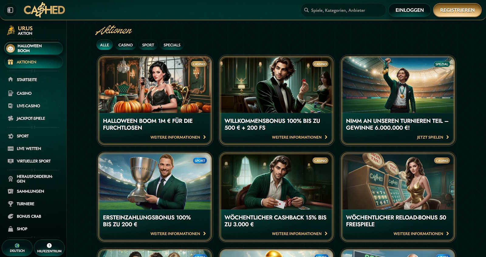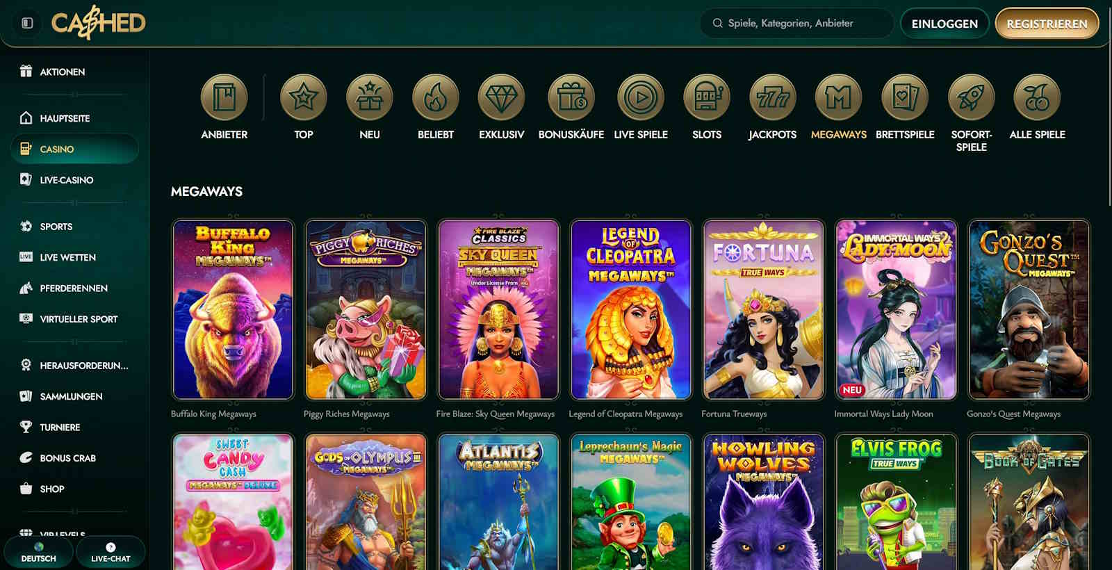 Bonusbedingungen 1. Dieses Angebot gilt nur für Neukunden, die sich auf unserer Website registriert und dort ihre erste Echtgeld-Einzahlung getätigt haben. 2. Der maximale Bonusbetrag beläuft sich auf 500 EUR. 3. Die Mindesteinzahlung, die nötig ist, um 100% Ersteinzahlungsbonus und 200 Freispiele zu erhalten, beträgt 20 EUR. 4. Nachdem die qualifizierende Einzahlung getätigt wurde, erhält der Spieler die Möglichkeit, den Einzahlungsbonus und die Freispiele nacheinander im Profilbereich zu aktivieren. 4.1 Freispiele für die erste Einzahlung werden 10 Tage lang als Block von 20 pro Tag hinzugefügt - insgesamt 200 Freispiele. Die ersten 20 Freispiele können ab dem Moment der qualifizierenden Einzahlung für die nächsten 24 Stunden in Anspruch genommen werden. Die folgenden Aufladungen von 20 Freispielen können an jedem der nächsten 9 Tage nach der genauen Stunde, zu der die erste Einzahlung getätigt wurde, innerhalb der nächsten 24 Stunden erneut in Anspruch genommen werden (zum Beispiel: wenn du deine erste Einzahlung heute um 10:30 Uhr tätigst, kann der erste Block von Bonus-Spins von heute 10:30 Uhr bis morgen 10:29 Uhr beansprucht werden. Der zweite Block kann morgen von 10:30 Uhr bis 10:29 Uhr am folgenden Tag beansprucht werden. 4.2 Jeder Block von 20 Freispielen kann innerhalb von 24 Stunden nach Verfügbarkeit beansprucht werden, andernfalls verfallen die Spins. 5. Der Bonus wird sofort nach einer erfolgreichen Einzahlung gutgeschrieben. Bitte kontaktieren Sie uns per Live-Chat oder E-Mail unter support@cashed.com, sollte der Bonus nicht gutgeschrieben werden. 6. Der Willkommensbonus kann nur eingefordert werden, bevor die qualifizierende Einzahlung für Einsätze verwendet wurde. 7. Eine Auszahlungsanforderung vor Inanspruchnahme des Bonus oder nach Aktivierung des Bonus führt zur Aufhebung der Bonusberechtigung. 8. Einzahlungen über Neteller oder Skrill berechtigen nicht zur Teilnahme an dieser Aktion. 9. Ein Spieler kann einen aktiven Bonus jederzeit im Profilbereich oder durch Kontaktaufnahme mit unserem Support-Team stornieren. Durch die Stornierung des Bonus wird der gesamte Betrag im Casino-Bonusguthaben ungültig. 10. Der maximale Einsatz, der während eines aktiven Casino-Bonus erlaubt ist, beträgt 5 EUR. 11. Die Umsatzbedingungen sind das 35-fache des ursprünglichen Einzahlungsbetrags und des erhaltenen Bonus. Die Umsatzbedingungen für Gewinne aus Freispielen sind x40. 12. Verschiedene Spiele tragen unterschiedlich zur Bonusfreigabe bei. Die vollständigen Bedingungen für den Casino-Bonus finden Sie in Abschnitt 7 der Allgemeinen Geschäftsbedingungen. 13. Die Umsatzbedingungen für einen Bonus müssen innerhalb von 10 Tagen nach Aktivierung des Bonus erfüllt erden. Sollte der Umsatz in diesem Zeitraum nicht erfüllt werden, werden der Bonusbetrag und mögliche Gewinne ungültig. 14. Dieser Bonus kann nicht gleichzeitig mit anderen Boni (Aktionen) kombiniert werden. Wenn Sie einen anderen Bonus aktivieren oder Freispiele beanspruchen, während Sie einen aktiven Bonus haben, werden der aktuelle aktive Bonus und alle entsprechenden Gewinne automatisch aufgehoben. 15. Diese Werbeaktion ist nicht befristet. Unsere Website behält sich jedoch das Recht vor, die Aktion nach eigenem Ermessen und ohne vorherige Ankündigung zu ändern und zu beenden. 16. Für diese Werbeaktion gelten die Allgemeinen Geschäftsbedingungen.