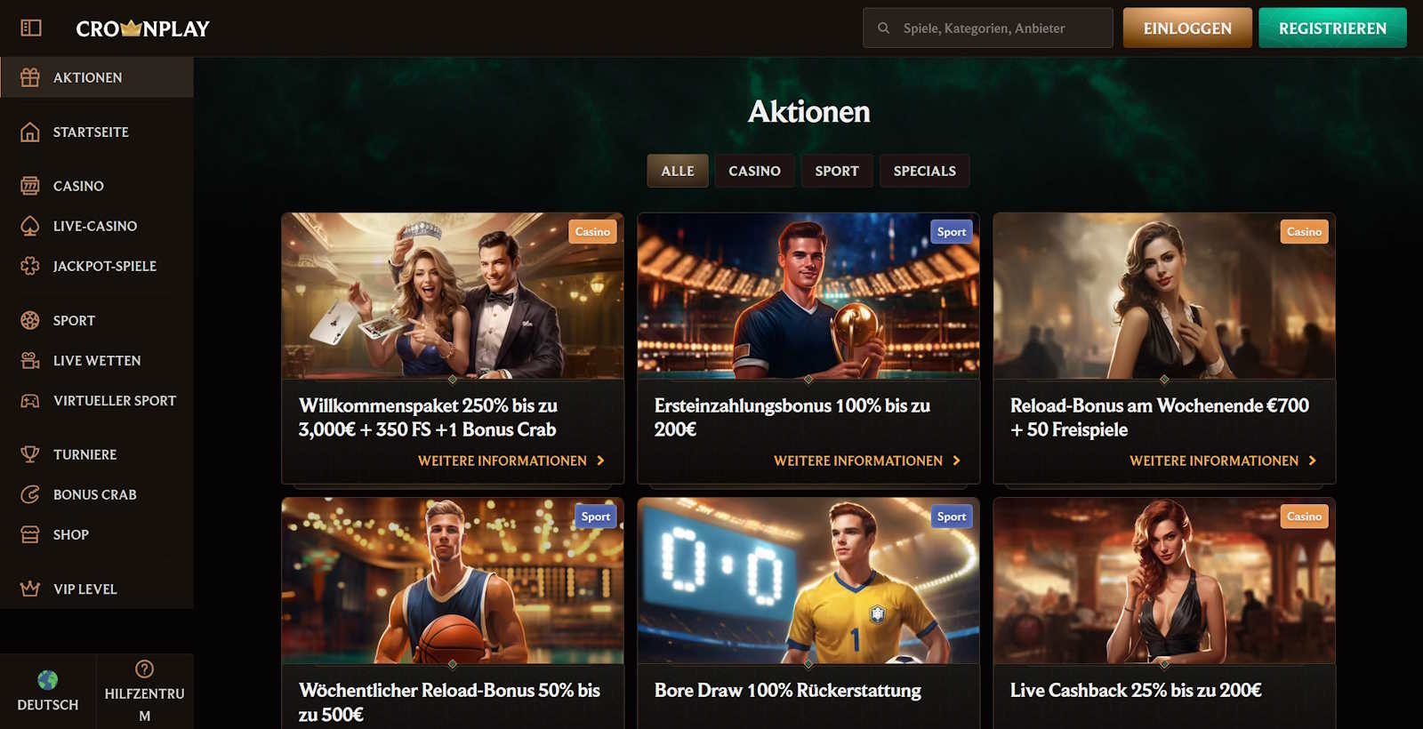 Bonusbedingungen 1.Dieses Angebot gilt nur für Neukunden, die sich auf unserer Website registriert und dort ihre erste Echtgeld-Einzahlung getätigt haben. 2.Mit der ersten Einzahlung in Höhe von mindestens 20 EUR erhältst du 1 Gratis-Pick bei der Bonuskrabbe. Ein Spieler kann sie nutzen, indem er den Bereich Bonuskrabbe besucht. 3.Die Mindesteinzahlung, um einen Bonus für die erste, zweite, dritte oder vierte Einzahlung zu erhalten, beträgt 20 EUR. 4.Die erste Einzahlung kann einen 100% Bonus bis zu einem Maximalbetrag von 1,000 EUR und 200 Freispiele aktivieren. 5.Die zweite Einzahlung kann einen Einzahlungsbonus von 75% bis zu einem Höchstbetrag von 500 EUR aktivieren. 6.Die dritte Einzahlung kann einen 50% Einzahlungsbetrag bis zum Maximalbetrag von 500 EUR und 50 Freispiele aktivieren. 7.Die vierte Einzahlung kann eine 25% Einzahlung bis zum Maximalbetrag von 1,000 EUR und 100 Freispiele aktivieren. 8.Der Bonus wird sofort nach einer erfolgreichen Einzahlung gutgeschrieben. Bitte kontaktieren Sie uns per Live-Chat oder E-Mail unter support@crownplay.com, sollte der Bonus nicht gutgeschrieben werden. 9.Jeder der Willkommensboni kann nur beansprucht werden, bevor Wetten mit der Ersteinzahlung getätigt werden. 10.Eine Auszahlungsanforderung vor Inanspruchnahme des Bonus oder nach Aktivierung des Bonus führt zur Aufhebung der Bonusberechtigung. 11.Einzahlungen über Neteller oder Skrill berechtigen nicht zur Teilnahme an dieser Aktion. 12.Ein Spieler kann einen aktiven Bonus jederzeit im Profilbereich oder durch Kontaktaufnahme mit unserem Support-Team stornieren. Durch die Stornierung des Bonus wird der gesamte Betrag im Casino-Bonusguthaben ungültig. 13.Der maximale Einsatz, der während eines aktiven Casino-Bonus erlaubt ist, beträgt 5 EUR. 14.Für alle Boni aus dem Willkommenspaket gilt eine 35-fache Umsatzbedingung, die der Summe aus Einzahlung und Bonusbeträgen entspricht. 15.Verschiedene Spiele tragen unterschiedlich zur Bonusfreigabe bei. Die vollständigen Bedingungen für den Casino Bonus findest du im Abschnitt 7 der Allgemeinen Geschäftsbedingungen. 16.Die Umsatzbedingungen für einen Bonus müssen innerhalb von 10 Tagen nach Aktivierung des Bonus erfüllt erden. Sollte der Umsatz in diesem Zeitraum nicht erfüllt werden, werden der Bonusbetrag und mögliche Gewinne ungültig. 17.Dieser Bonus kann nicht gleichzeitig mit anderen Boni (Aktionen) kombiniert werden. Wenn du einen anderen Bonus aktivierst oder Freispiele in Anspruch nimmst, während du einen aktiven Bonus hast, werden der aktuelle aktive Bonus und alle entsprechenden Gewinne automatisch entfernt. 18.Diese Aktion ist nicht befristet. Unsere Website behält sich jedoch das Recht vor, die Aktion nach eigenem Ermessen und ohne vorherige Ankündigung zu ändern und zu beenden. 19.Diese Aktion ist in Übereinstimmung mit den Allgemeinen Geschäftsbedingungen gültig.