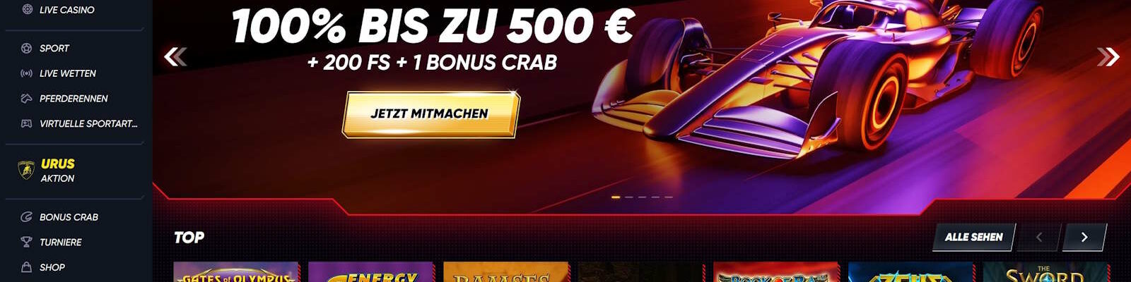 ➥ 100% bis 500 € + 200 FS + Bonus Crab
