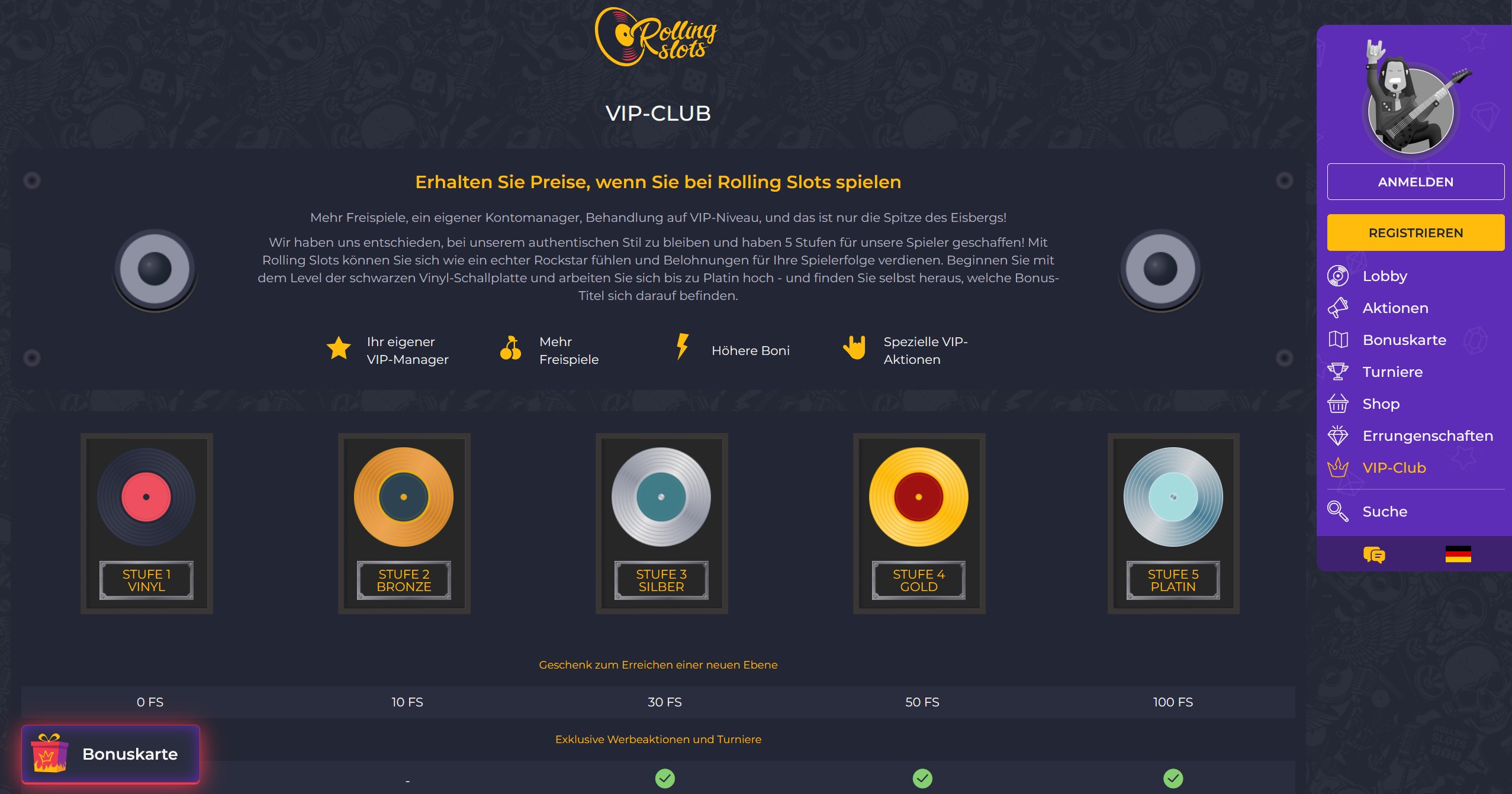 Bonusbedingungen 4-fach Bonus bis zu insgesamt 3500 € + 550 FS verfügbar Ein 100% Bonus bis zu 555 € ist für eine Einzahlung von 20 € oder mehr verfügbar. Ein 100% Bonus bis zu 500 € + 200 Freispiele ist für eine Einzahlung von 50 € oder mehr verfügbar. Spieler erhalten 25 Freispiele pro Tag für 8 aufeinanderfolgende Tage. Der maximale Bonuseinsatz beträgt 5 €. Einzahlungen über Neteller oder Skrill von in Irland und Kroatien registrierten Spielern sind von dieser Aktion ausgeschlossen. Boni werden dem Spielerkonto gutgeschrieben, sobald der ausgewählte Bonus in der Kasse gewählt und eine qualifizierende Einzahlung vorgenommen wurde. Sollte der Bonus nicht gutgeschrieben werden, kontaktieren Sie uns bitte über den Live Chat oder per E-Mail an support@rollingslots.com. Münzen werden auf der Seite Errungenschaften verfügbar, sobald die erste Einzahlung erfolgt ist. Sie werden dem Guthaben gutgeschrieben, nachdem der entsprechende Button neben der freigeschalteten Errungenschaft geklickt wurde. Boni müssen innerhalb von 48 Stunden nach der Gutschrift auf dem Benutzerkonto aktiviert werden. Boni verfallen 5 Tage nach der Aktivierung. Wenn die Umsatzbedingungen nicht innerhalb dieses Zeitraums erfüllt werden, werden sowohl das Bonusguthaben als auch alle daraus resultierenden Gewinne storniert. Die Umsatzbedingungen für Cash- und Freispiele-Boni sind auf 45x festgelegt. Die Umsatzbedingungen für Cash- und Freispiele-Boni für Spieler aus Finnland, Irland und Kroatien sind auf 45x festgelegt und gelten für die Summe aus Einzahlung und Bonusbetrag. Die Auszahlung von Gewinnen aus Geldboni ist auf das 10-fache des Einzahlungsbetrags begrenzt. Die Auszahlung von Gewinnen aus Freispiele-Boni ist auf 100 € begrenzt. Ein Bonus kann nicht gutgeschrieben werden, wenn eine aktive Auszahlungsanforderung auf dem Konto vorliegt. Bei einer Auszahlungsanforderung wird ein aktiver Bonus automatisch vom Guthaben des Spielers entfernt. Ein nicht genutzter Bonus kann nach der Bearbeitung der Auszahlungsanforderung nicht erneut gutgeschrieben werden. Das Angebot unterliegt den allgemeinen Bonusregeln sowie den Geschäftsbedingungen des Casinos.
